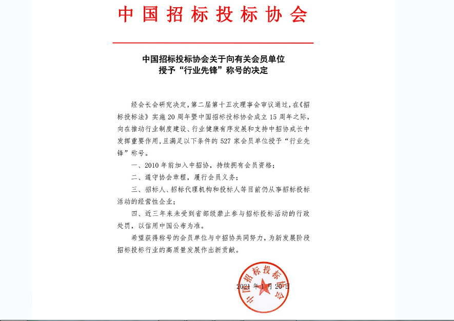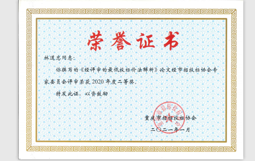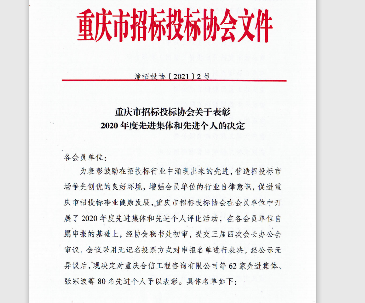 金牛盈門,萬象俱新。走過2020,我們不留遺憾,來到2021,欣宏達繼續(xù)奮發(fā)昂揚。新年一月,正是揚帆遠眺,宏圖待興之時,重慶欣宏達項目管理有限公司捷報頻傳! 2021年1月20日,中國招標(biāo)投標(biāo)協(xié)會“2020年招標(biāo)投標(biāo)行業(yè)發(fā)布會”在線召開。會上,任瓏會長宣讀了“關(guān)于向有關(guān)會員單位授予‘行業(yè)先鋒’稱號的決定”。重慶欣宏達項目管理有限公司獲得“行業(yè)先鋒”稱號,對我公司長期以來推動行業(yè)制度建設(shè)、行業(yè)健康有序發(fā)展和支持中國招標(biāo)投標(biāo)協(xié)會成長中發(fā)揮重要作用給予高度肯定。 2021年1月18日,重慶市招標(biāo)投標(biāo)協(xié)會發(fā)布了《重慶市招標(biāo)投標(biāo)協(xié)會關(guān)于表彰2020年度先進集體和先進個人的決定》,重慶欣宏達項目管理有限公司及公司招采六部主任李亮廷分別獲得“先進集體”與“先進個人”表彰,為公司大廳的榮譽墻上再添兩枚獎?wù)隆?span lang="EN-US"> 花開兩朵,平添喜訊。近日,重慶市招標(biāo)投標(biāo)協(xié)會發(fā)布了《關(guān)于對2020年度獲獎?wù)撐牡耐▓蟆,由我公司總工程師林道忠?zhí)筆的課題論文《經(jīng)評審的最低投標(biāo)價法解析》榮獲二等獎。 以上榮譽既是各界對欣宏達公司的認(rèn)同和肯定,但也滿懷著對我們未來的更大期望。我們堅信,欣宏達終將不負眾望,保持良好發(fā)展勢頭,繼續(xù)前行,在未來斬獲更多的榮譽、創(chuàng)造更加輝煌的成績!