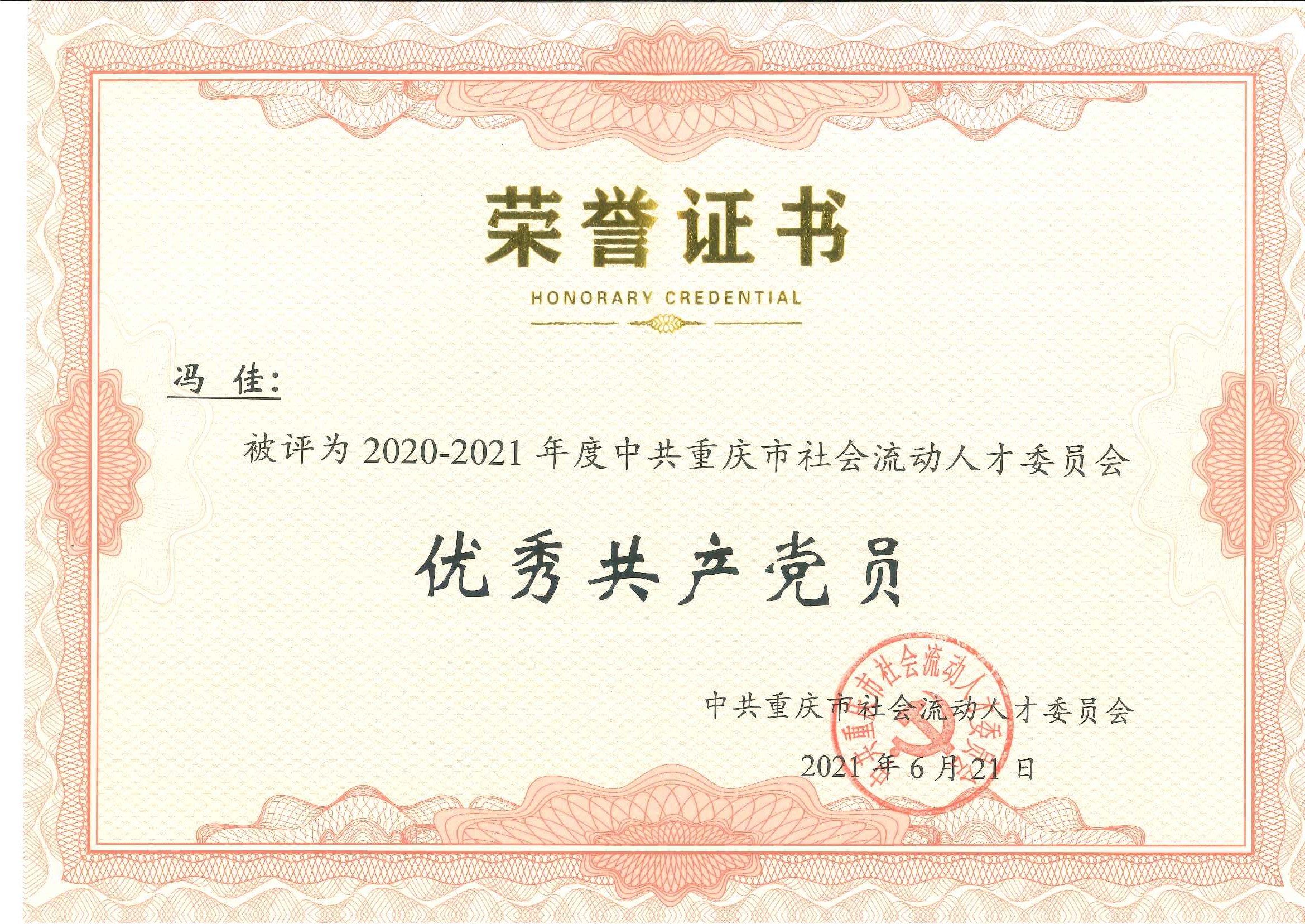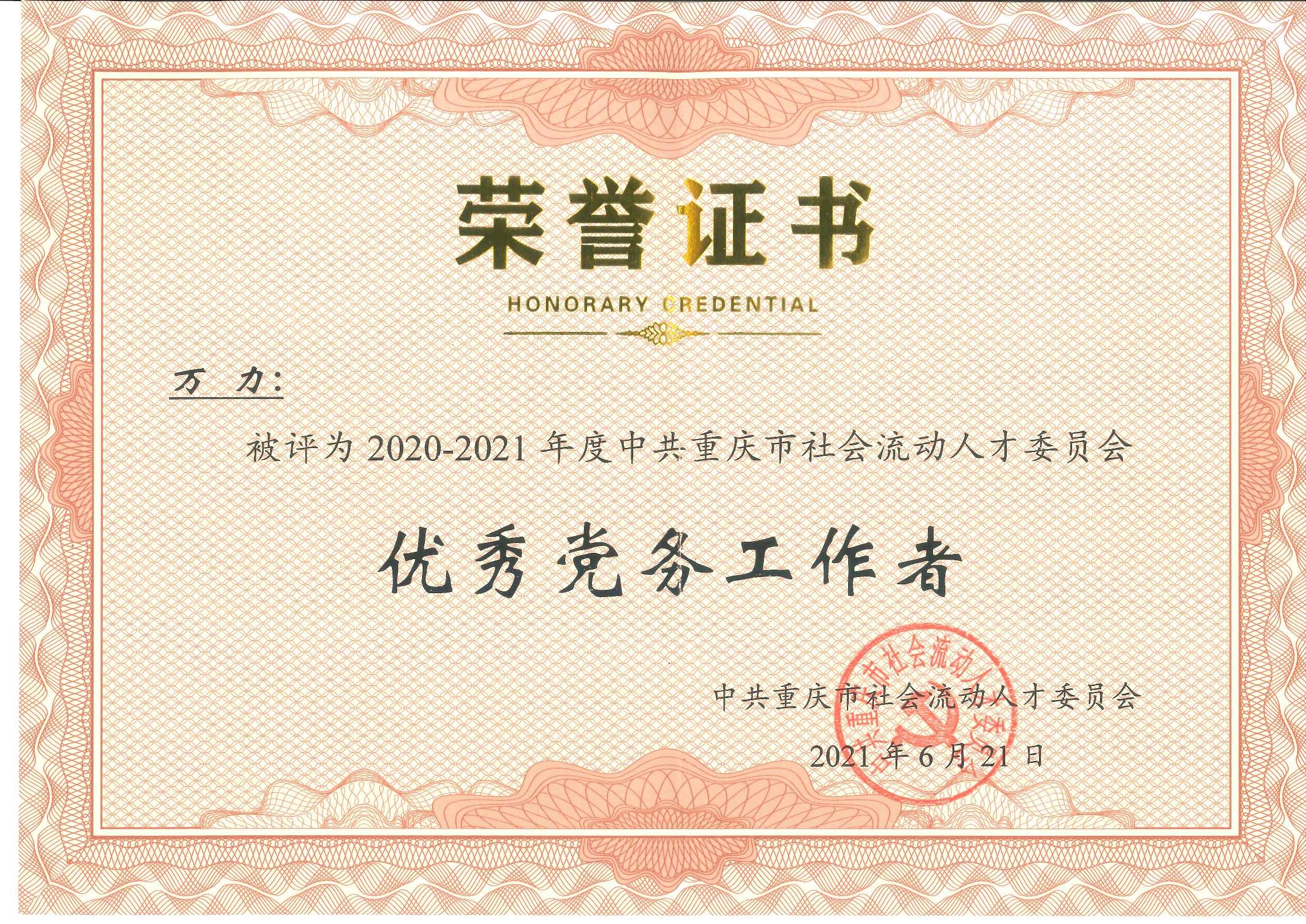 在中國共產(chǎn)黨成立100周年之際,為表彰先進、弘揚正氣、樹立標桿、鼓舞斗志,激勵各級黨組織和廣大共產(chǎn)黨員不忘初心、牢記使命,擔當作為,6月26日上午,中共重慶市社會流動黨委召開“慶祝中國共產(chǎn)黨成立100周年暨中共重慶市社會流動人才委員會2020-2021表彰大會”。中共重慶社會流動人才黨委第二總支第2支部欣宏達小組萬力同志榮獲優(yōu)秀黨務(wù)工作者,馮佳同志榮獲優(yōu)秀共產(chǎn)黨員。 ![]() ![]() |