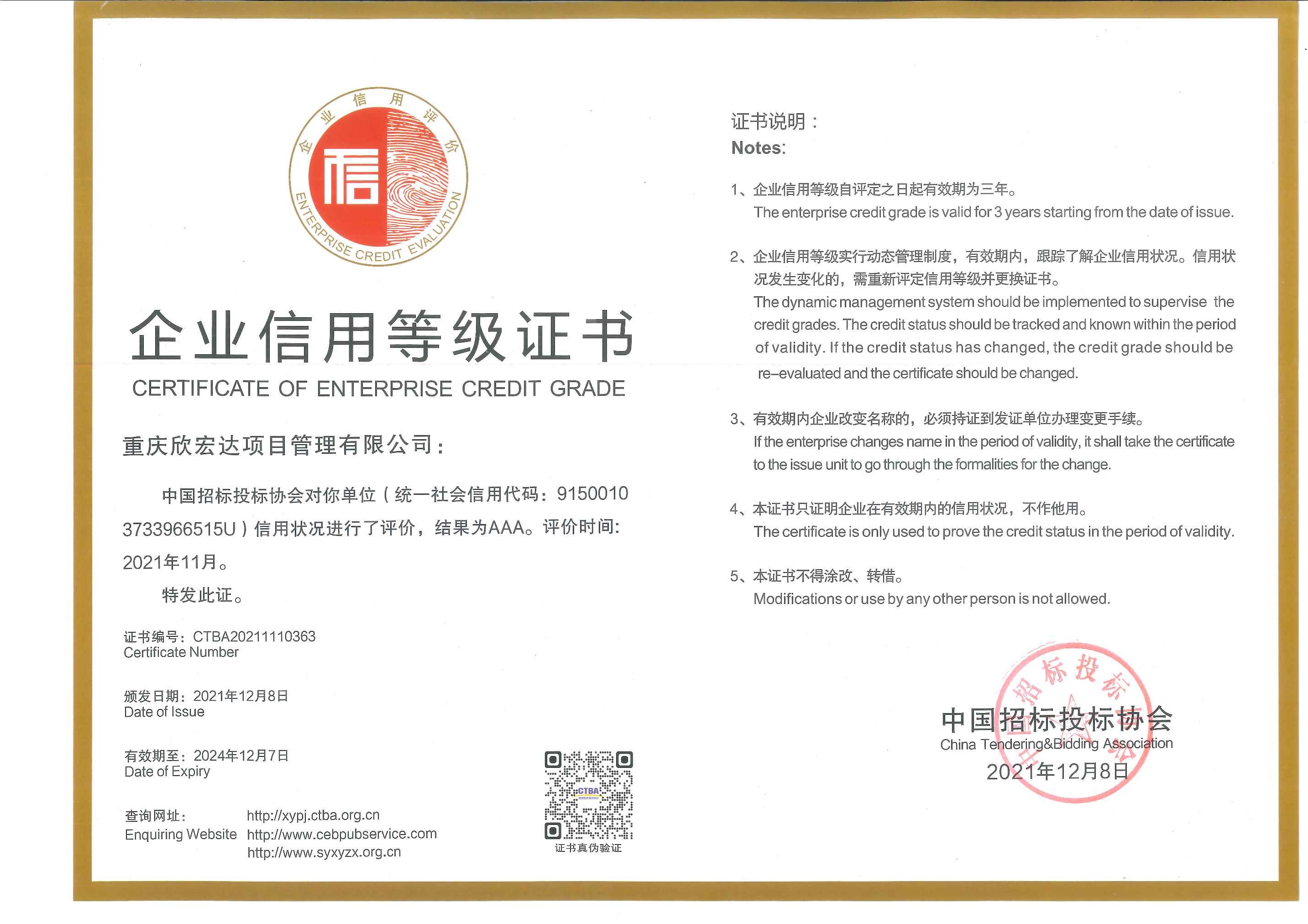 | 2021年12月8日,中國(guó)招標(biāo)投標(biāo)協(xié)會(huì)發(fā)布《中國(guó)招標(biāo)投標(biāo)協(xié)會(huì)招標(biāo)代理機(jī)構(gòu)2021年信用評(píng)價(jià)結(jié)果公告》,重慶欣宏達(dá)項(xiàng)目管理有限公司榜上有名,獲得首次由中招協(xié)委托的第三方獨(dú)立信用評(píng)價(jià)服務(wù)機(jī)構(gòu)評(píng)價(jià)的招標(biāo)代理機(jī)構(gòu)企業(yè)信用3A級(jí)證書。這是國(guó)家行業(yè)協(xié)會(huì)對(duì)重慶欣宏達(dá)公司誠(chéng)信經(jīng)營(yíng)的高度認(rèn)可,同時(shí)也彰顯了欣宏達(dá)公司的綜合實(shí)力。 根據(jù)《中國(guó)招標(biāo)投標(biāo)行業(yè)信用評(píng)價(jià)管理辦法(試行)》,中國(guó)招標(biāo)投標(biāo)行業(yè)信用評(píng)價(jià)等級(jí)共分“三等九級(jí)”,等級(jí)標(biāo)準(zhǔn)分為A、B、C三等五級(jí),下設(shè)AAA、AA、A、BBB、CCC,每個(gè)等級(jí)均對(duì)應(yīng)相應(yīng)的信用狀況。AAA級(jí)是信用級(jí)別最高的等級(jí)。 中國(guó)招標(biāo)投標(biāo)行業(yè)協(xié)會(huì)對(duì)招標(biāo)代理機(jī)構(gòu)的信用評(píng)價(jià)從“企業(yè)基本信息、經(jīng)營(yíng)管理信息、財(cái)務(wù)狀況信息、公共信用信息、行業(yè)評(píng)價(jià)”五部分進(jìn)行綜合評(píng)價(jià)。企業(yè)基本信息由注冊(cè)信息、關(guān)聯(lián)關(guān)系、黨的組織建設(shè)、變更信息組成;經(jīng)營(yíng)管理信息由人力資源信息、內(nèi)部控制管理體系、經(jīng)營(yíng)規(guī)模、履約情況、信息化能力、拓展能力組成;財(cái)務(wù)狀況信息由盈利能力、償債能力、營(yíng)運(yùn)能力、成長(zhǎng)能力組成;公共信用信息由榮譽(yù)獎(jiǎng)勵(lì)、市場(chǎng)監(jiān)管信息、經(jīng)營(yíng)合規(guī)、稅務(wù)信息、司法信息、輿情信息組成、行業(yè)評(píng)價(jià)由業(yè)主評(píng)價(jià)、協(xié)會(huì)評(píng)價(jià)組成。招標(biāo)代理機(jī)構(gòu)信用評(píng)價(jià)指標(biāo)由5項(xiàng)一級(jí)指標(biāo)、21項(xiàng)二級(jí)指標(biāo)和48項(xiàng)三級(jí)指標(biāo)構(gòu)成,按百分制分別賦予不同權(quán)重,按得分高低劃分評(píng)價(jià)等級(jí)。 中國(guó)招標(biāo)投標(biāo)協(xié)會(huì)于2021年10月12日發(fā)布了《關(guān)于在招標(biāo)代理機(jī)構(gòu)會(huì)員企業(yè)中開(kāi)展中國(guó)招標(biāo)投標(biāo)行業(yè)信用評(píng)價(jià)試點(diǎn)工作的通知》,參評(píng)企業(yè)申報(bào)材料截止時(shí)間為10月31日,協(xié)會(huì)按《中國(guó)招標(biāo)投標(biāo)行業(yè)信用評(píng)價(jià)管理辦法》、《招標(biāo)代理機(jī)構(gòu)信用評(píng)價(jià)指標(biāo)標(biāo)準(zhǔn)》組織第三方信用評(píng)價(jià)機(jī)構(gòu)對(duì)參評(píng)企業(yè)申報(bào)材料進(jìn)行評(píng)價(jià),全國(guó)共有450家代理機(jī)構(gòu)獲AAA級(jí),30家企業(yè)獲AA級(jí)。證書有效期三年。 2022年1月4日