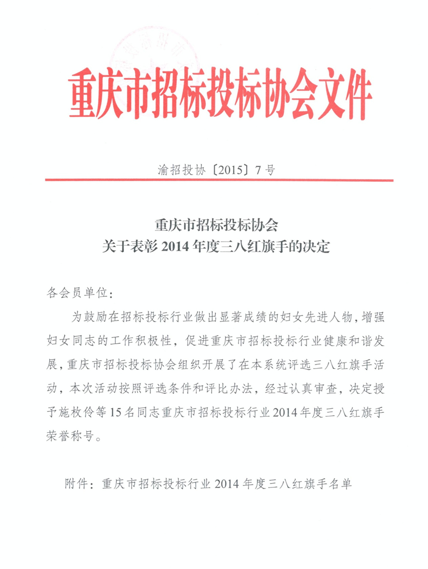 公司牟成梅同志被重慶招投標(biāo)協(xié)會授予重慶市招投標(biāo)行業(yè)2014年度三八紅旗手榮譽(yù)稱號